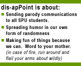 President Phil Eaton signed a mandate today at the urging of Second Essence (SPU's very own yearly publication of the arts) calling for the capture and questioning of anyone thought to be involved with the shady "Blum Poets Society." According to the Second Essence staff, this group of SPU students, inspired by the rebel film "The Dead Poets Society," has been meeting clandestinely somewhere off-campus, where they read non-Second-Essence-approved poetry. "We've heard they openly mock the Second Essence selection criteria, some of them even submitting computer-generated random poetry to our esteemed publication," said a spokesman for Second Essence. "Their meetings reportedly consist of sitting around and reading the works of the so-called 'great' poets like Robert Frost and Henry Wadsworth Longfellow. This is in clear violation of Second Essence's long-standing slogan 'Obscurity is Genius.' The fact that we publish mental flatulence in stanzas doesn't give people the right to look elsewhere for inspiration." Anyone with information about these criminals is urged to call President Phil Eaton at extension 2114.