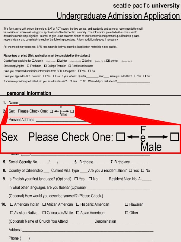 This just in: University Officials have moved the SPU ratio, recently believed to favor females by a wide margin, back into the "undecided" column. Kathleen Braden, head of Student Life, held a press conference this morning in which she asserted that there had been some confusion in the application process, and there was a possibility that hundreds of SPU students had been disenfranchised from being assigned the proper gender. "The gender selection part of the application was clearly very confusing," said Matt Basinger, leader of a group of students fighting for reapplication, "After I had mailed my application, I realized my mistake, and I broke down and wept for hours." On being asked if he was merely a guy who wanted to live on the sly in a girl apartment, Matt just looked at his shoes and blushed. The DUI was able to obtain one of these allegedly confusing applications, and we have provided a scan of the gender selection section. You can click on the excerpt at right for a full-sized view of the application.